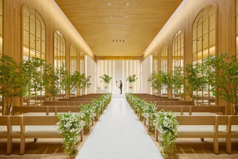 【天然木の温もりと優しい光に包まれるチャペル】側面のアーチが印象的なオシャレ空間。シアター型で《ふたりらしい誓いの瞬間》をゲストみんなに見守ってもらえる!迫力の大型スクリーンなど最新設備を体感♪